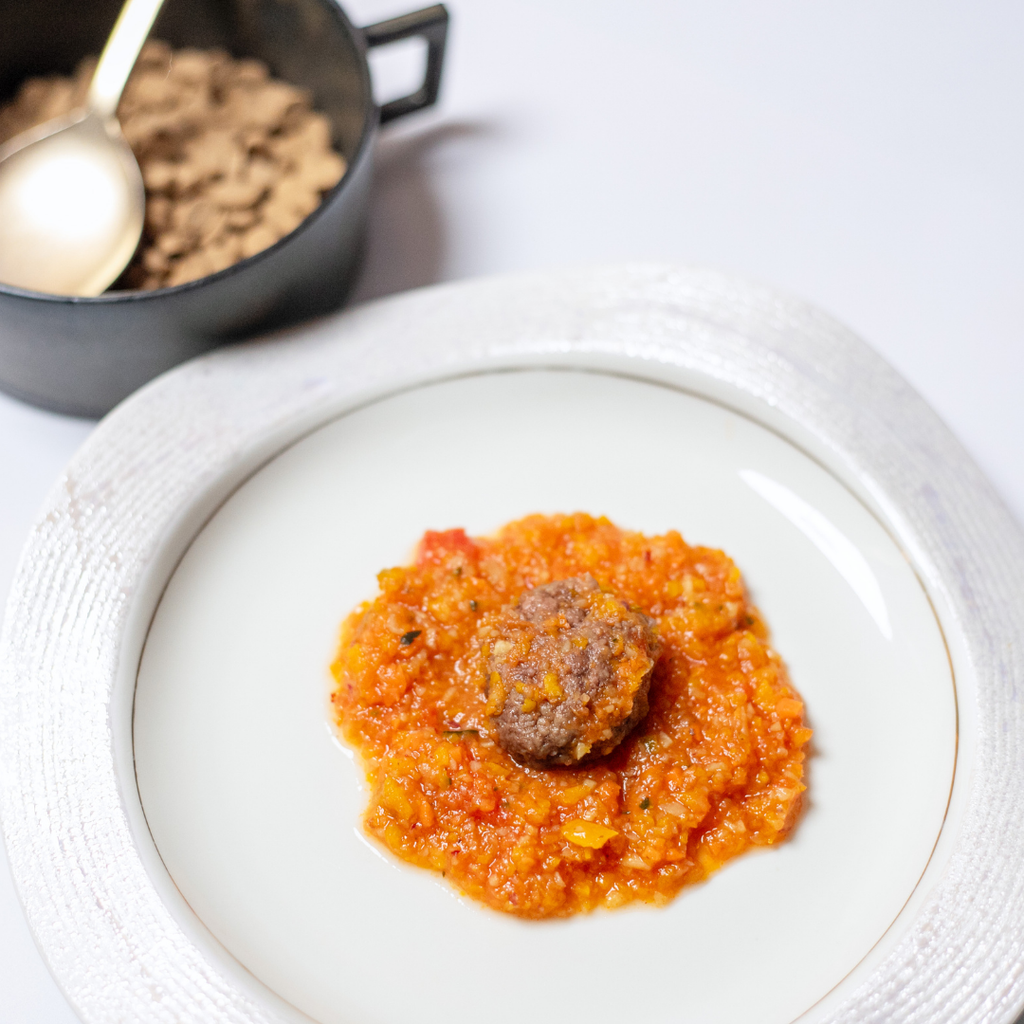 【原材料】鹿肉ミンチ(京都笠置)、鹿ボーンブロス、ビーツ、じゃがいも、人参、オリーブ油、吉野本葛、コリアンダー、クミン、ターメリック
